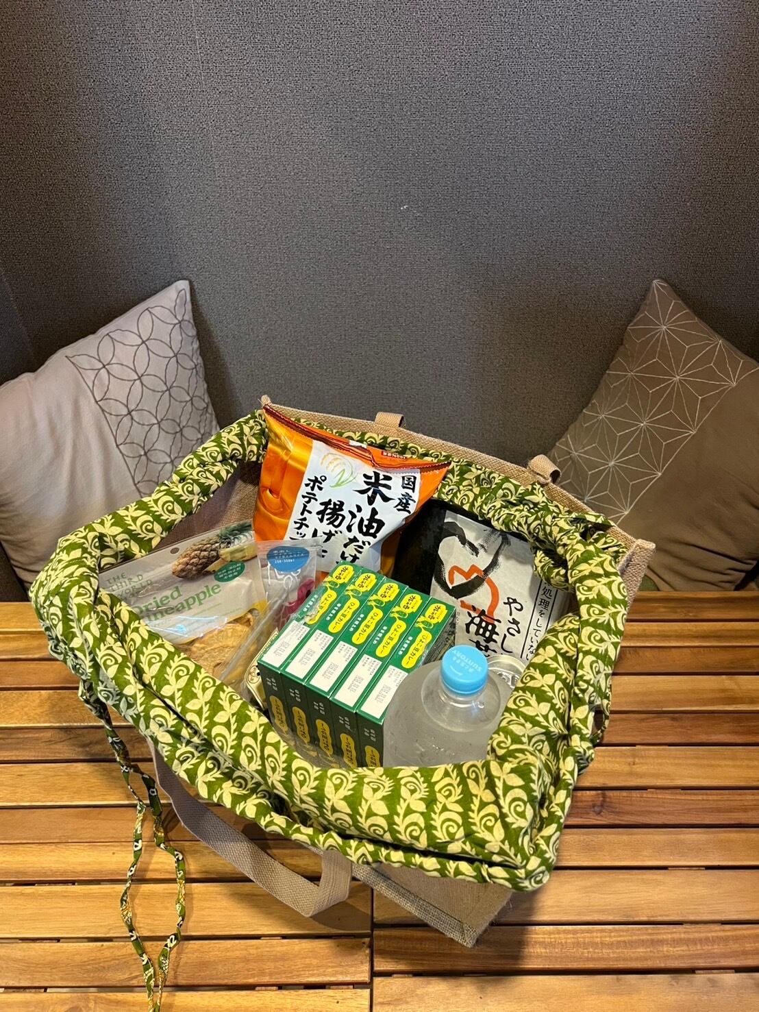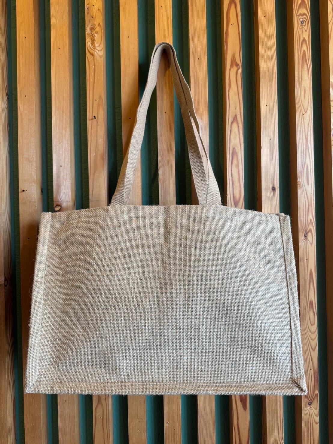 レジかごにそのまま入れてお会計できる便利なジュートバッグです。上部はアソートカラーのリサイクルサリーで巾着になっていて、中身が見えず持ち運びができます。たっぷり入ります。