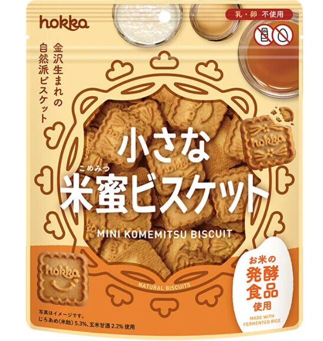金沢伝統の味、俵屋のじろあめを使用し、てんさい糖、じろあめ(米飴)、玄米甘酒からくるおだやかな甘味の自然派ビスケット「米蜜ビスケット」シリーズの食べやすいミニサイズ。