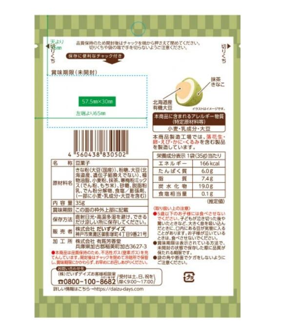 ■原材料:きな粉(大豆(国産))、粉糖、大豆(北海道産、遺伝子組換えでない)、植物油脂、小麦粉、抹茶、寒梅粉ミックス(でん粉、もち米)、砂糖、脱脂粉乳、でん粉分解物、食塩/膨張剤、(一部に小麦・乳成分・大豆を含む)