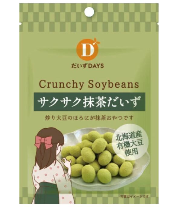 ほろにがい抹茶フレーバーのサクサク炒り大豆のおやつです。