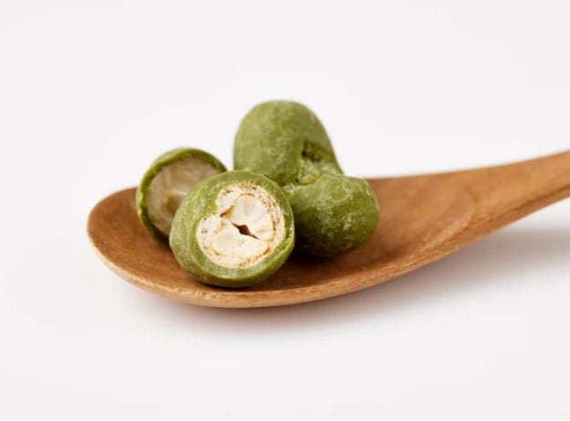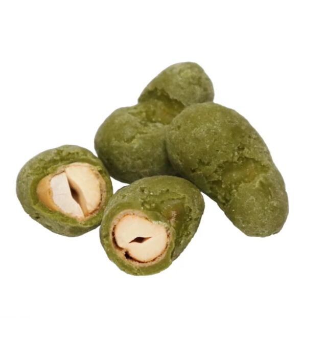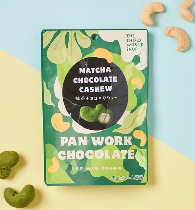 オーガニック(有機栽培)やフェアトレードの原材料使用 サクサクの衣で包んだカシューナッツを、抹茶入りのホワイトクーベルチュールチョコでコーティング。